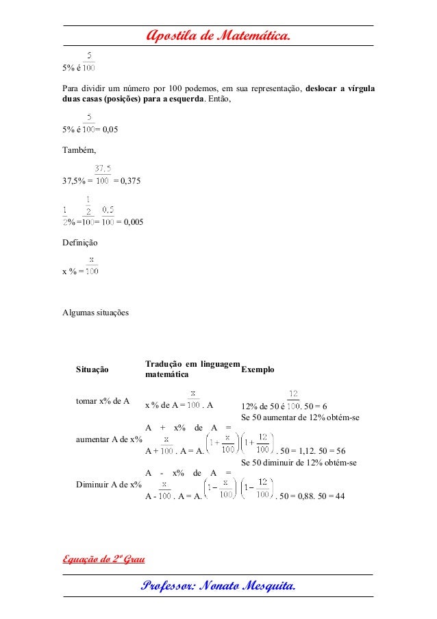 7. 7. Apostila de Matemática.5% éPara dividir um número por 100 podemos, em sua representação, deslocar a vírguladuas casas (posições) para a esquerda. Então,5% é = 0,05Também,37,5% = = 0,375 %= = = 0,005Definiçãox%=Algumas situações Tradução em linguagem Situação Exemplo matemática tomar x% de A x % de A = .A 12% de 50 é . 50 = 6 Se 50 aumentar de 12% obtém-se A + x% de A = aumentar A de x% A+ . A = A. . 50 = 1,12. 50 = 56 Se 50 diminuir de 12% obtém-se A - x% de A = Diminuir A de x% A- . A = A. . 50 = 0,88. 50 = 44Equação do 2º Grau Professor: Nonato Mesquita.