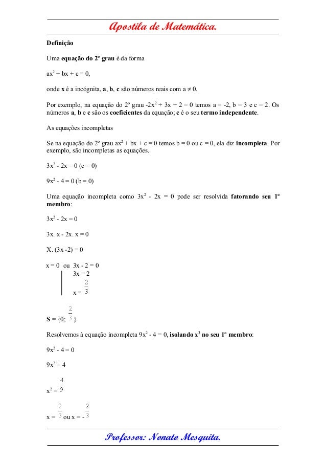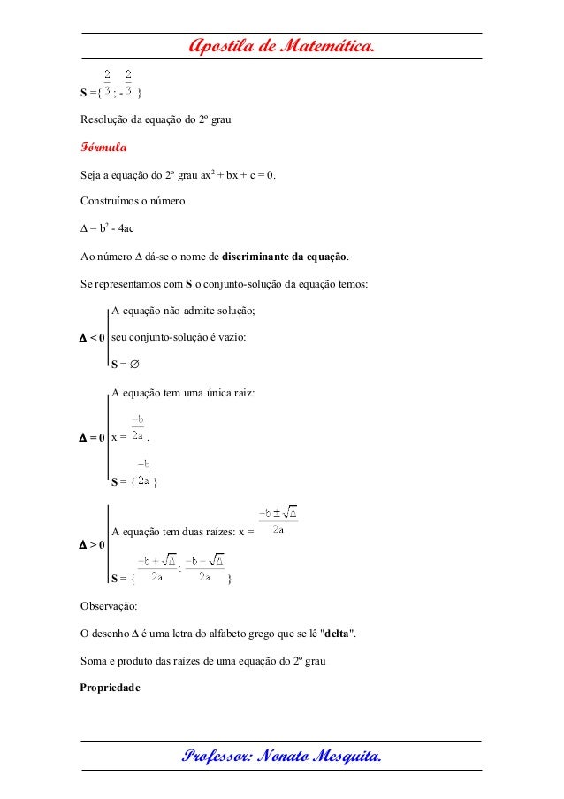 9. 9. Apostila de Matemática.S ={ ;- }Resolução da equação do 2º grauFórmulaSeja a equação do 2º grau ax2 + bx + c = 0.Construímos o número∆ = b2 - 4acAo número ∆ dá-se o nome de discriminante da equação.Se representamos com S o conjunto-solução da equação temos: A equação não admite solução;∆ < 0 seu conjunto-solução é vazio: S=∅ A equação tem uma única raiz:∆ =0 x= . S={ } A equação tem duas raízes: x =∆>0 S={ }Observação:O desenho ∆ é uma letra do alfabeto grego que se lê "delta".Soma e produto das raízes de uma equação do 2º grauPropriedade Professor: Nonato Mesquita.