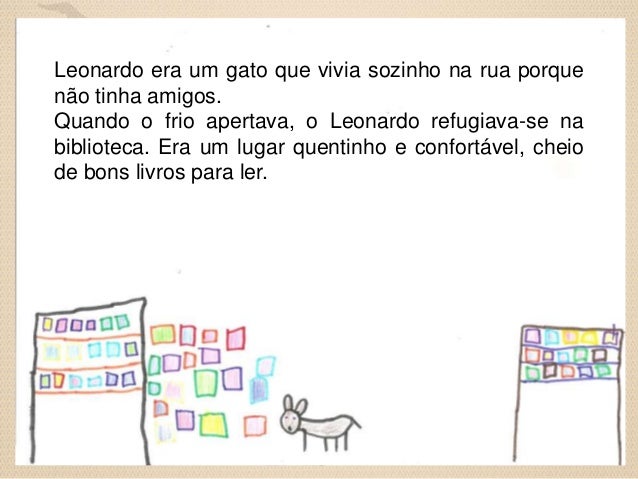 2. 2. Leonardo era um gato que vivia sozinho na rua porque não tinha amigos. Quando o frio apertava, o Leonardo refugiava-se na biblioteca. Era um lugar quentinho e confortável, cheio de bons livros para ler.