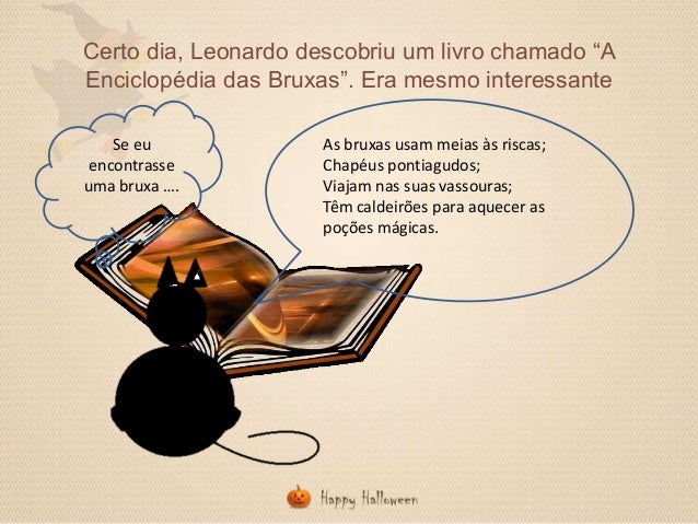 3. 3. Certo dia, Leonardo descobriu um livro chamado “A Enciclopédia das Bruxas”. Era mesmo interessante Se eu encontrasse uma bruxa …. As bruxas usam meias às riscas; Chapéus pontiagudos; Viajam nas suas vassouras; Têm caldeirões para aquecer as poções mágicas.