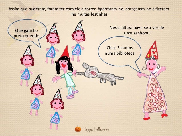 9. 9. Assim que puderam, foram ter com ele a correr. Agarraram-no, abraçaram-no e fizeramlhe muitas festinhas. Que gatinho preto querido Nessa altura ouve-se a voz de uma senhora: Chiu! Estamos numa biblioteca