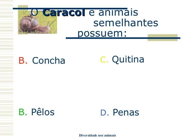 10. 10. O Caracol e animais semelhantes possuem: <ul><li>Concha </li></ul><ul><li>B. Pêlos </li></ul><ul><li>C. Quitina </li></ul><ul><li>D. Penas </li></ul>