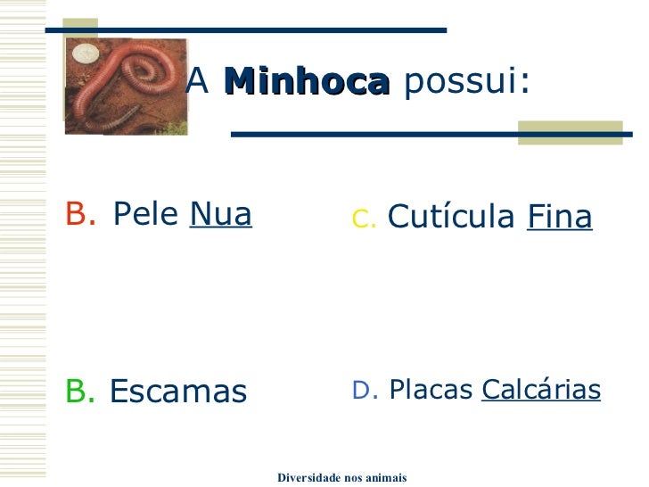 11. 11. A Minhoca possui: <ul><li>Pele Nua </li></ul><ul><li>B. Escamas </li></ul><ul><li>C. Cutícula Fina </li></ul><ul><li>D. Placas Calcárias </li></ul>