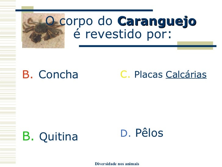 12. 12. O corpo do Caranguejo é revestido por : <ul><li>Concha </li></ul><ul><li>B. Quitina </li></ul><ul><li>C. Placas Calcárias </li></ul><ul><li>D. Pêlos </li></ul>