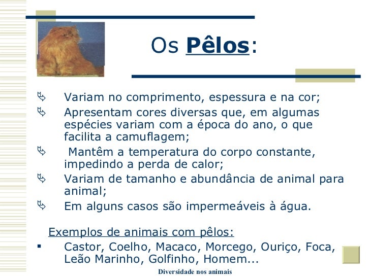 14. 14. Os Pêlos : <ul><li>Variam no comprimento, espessura e na cor; </li></ul><ul><li>Apresentam cores diversas que, em algumas espécies variam com a época do ano, o que facilita a camuflagem; </li></ul><ul><li>Mantêm a temperatura do corpo constante, impedindo a perda de calor; </li></ul><ul><li>Variam de tamanho e abundância de animal para animal; </li></ul><ul><li>Em alguns casos são impermeáveis à água. </li></ul><ul><li>Exemplos de animais com pêlos: </li></ul><ul><li>Castor, Coelho, Macaco, Morcego, Ouriço, Foca, Leão Marinho, Golfinho, Homem... </li></ul>