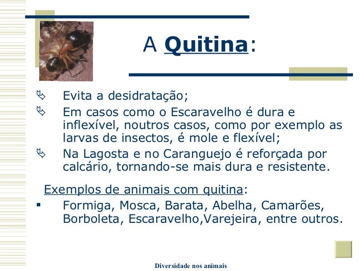 16. 16. A Quitina : <ul><li>Evita a desidratação; </li></ul><ul><li>Em casos como o Escaravelho é dura e inflexível, noutros casos, como por exemplo as larvas de insectos, é mole e flexível; </li></ul><ul><li>Na Lagosta e no Caranguejo é reforçada por calcário, tornando-se mais dura e resistente. </li></ul><ul><li>Exemplos de animais com quitina : </li></ul><ul><li>Formiga, Mosca, Barata, Abelha, Camarões, Borboleta, Escaravelho,Varejeira, entre outros. </li></ul>