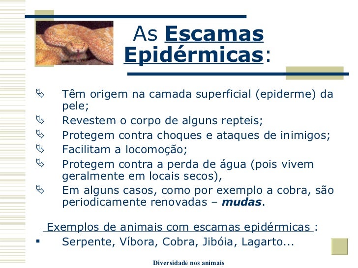 17. 17. As Escamas Epidérmicas : <ul><li>Têm origem na camada superficial (epiderme) da pele; </li></ul><ul><li>Revestem o corpo de alguns repteis; </li></ul><ul><li>Protegem contra choques e ataques de inimigos; </li></ul><ul><li>Facilitam a locomoção; </li></ul><ul><li>Protegem contra a perda de água (pois vivem geralmente em locais secos), </li></ul><ul><li>Em alguns casos, como por exemplo a cobra, são periodicamente renovadas – mudas . </li></ul><ul><li>Exemplos de animais com escamas epidérmicas : </li></ul><ul><li>Serpente, Víbora, Cobra, Jibóia, Lagarto... </li></ul>