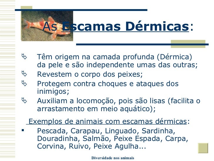 18. 18. As Escamas Dérmicas : <ul><li>Têm origem na camada profunda (Dérmica) da pele e são independente umas das outras; </li></ul><ul><li>Revestem o corpo dos peixes; </li></ul><ul><li>Protegem contra choques e ataques dos inimigos; </li></ul><ul><li>Auxiliam a locomoção, pois são lisas (facilita o arrastamento em meio aquático); </li></ul><ul><li>Exemplos de animais com escamas dérmicas : </li></ul><ul><li>Pescada, Carapau, Linguado, Sardinha, Douradinha, Salmão, Peixe Espada, Carpa, Corvina, Ruivo, Peixe Agulha... </li></ul>