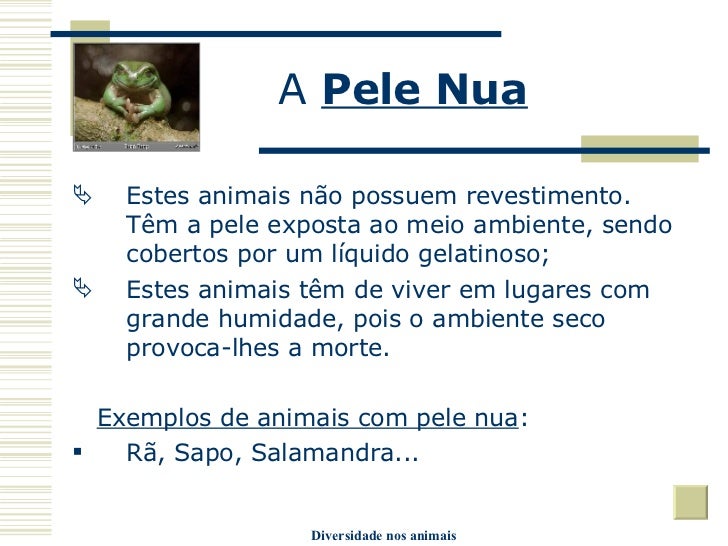 19. 19. A Pele Nua <ul><li>Estes animais não possuem revestimento. Têm a pele exposta ao meio ambiente, sendo cobertos por um líquido gelatinoso; </li></ul><ul><li>Estes animais têm de viver em lugares com grande humidade, pois o ambiente seco provoca-lhes a morte. </li></ul><ul><li>Exemplos de animais com pele nua : </li></ul><ul><li>Rã, Sapo, Salamandra... </li></ul>