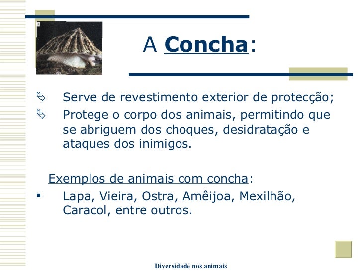 20. 20. A Concha : <ul><li>Serve de revestimento exterior de protecção; </li></ul><ul><li>Protege o corpo dos animais, permitindo que se abriguem dos choques, desidratação e ataques dos inimigos. </li></ul><ul><li>Exemplos de animais com concha : </li></ul><ul><li>Lapa, Vieira, Ostra, Amêijoa, Mexilhão, Caracol, entre outros. </li></ul>