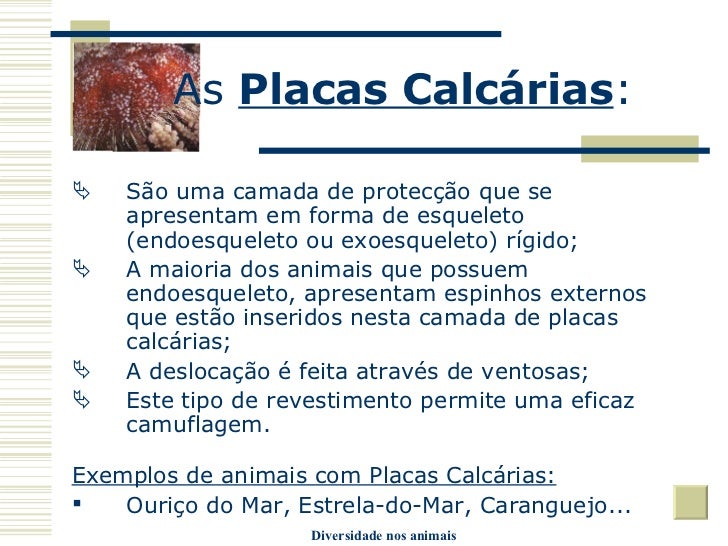 21. 21. As Placas Calcárias : <ul><li>São uma camada de protecção que se apresentam em forma de esqueleto (endoesqueleto ou exoesqueleto) rígido; </li></ul><ul><li>A maioria dos animais que possuem endoesqueleto, apresentam espinhos externos que estão inseridos nesta camada de placas calcárias; </li></ul><ul><li>A deslocação é feita através de ventosas; </li></ul><ul><li>Este tipo de revestimento permite uma eficaz camuflagem. </li></ul><ul><li>Exemplos de animais com Placas Calcárias: </li></ul><ul><li>Ouriço do Mar, Estrela-do-Mar, Caranguejo... </li></ul>