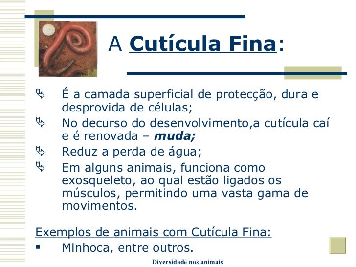 22. 22. A Cutícula Fina : <ul><li>É a camada superficial de protecção, dura e desprovida de células; </li></ul><ul><li>No decurso do desenvolvimento,a cutícula caí e é renovada – muda; </li></ul><ul><li>Reduz a perda de água; </li></ul><ul><li>Em alguns animais, funciona como exosqueleto, ao qual estão ligados os músculos, permitindo uma vasta gama de movimentos. </li></ul><ul><li>Exemplos de animais com Cutícula Fina: </li></ul><ul><li>Minhoca, entre outros. </li></ul>