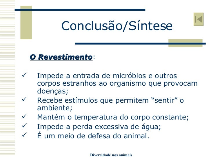 23. 23. Conclusão/Síntese <ul><li>O Revestimento : </li></ul><ul><li>Impede a entrada de micróbios e outros corpos estranhos ao organismo que provocam doenças; </li></ul><ul><li>Recebe estímulos que permitem “sentir” o ambiente; </li></ul><ul><li>Mantém o temperatura do corpo constante; </li></ul><ul><li>Impede a perda excessiva de água; </li></ul><ul><li>É um meio de defesa do animal. </li></ul>