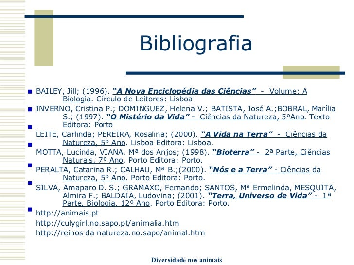 24. 24. Bibliografia <ul><li>BAILEY, Jill; (1996). “A Nova Enciclopédia das Ciências” - Volume: A Biologia . Círculo de Leitores: Lisboa </li></ul><ul><li>INVERNO, Cristina P.; DOMINGUEZ, Helena V.; BATISTA, José A.;BOBRAL, Marília S.; (1997). “O Mistério da Vida” - Ciências da Natureza, 5ºAno . Texto Editora: Porto </li></ul><ul><li>LEITE, Carlinda; PEREIRA, Rosalina; (2000). “A Vida na Terra” - Ciências da Natureza, 5º Ano . Lisboa Editora: Lisboa. </li></ul><ul><li>MOTTA, Lucinda, VIANA, Mª dos Anjos; (1998). “Bioterra” - 2ª Parte, Ciências Naturais, 7º Ano . Porto Editora: Porto. </li></ul><ul><li>PERALTA, Catarina R.; CALHAU, Mª B.;(2000). “Nós e a Terra” - Ciências da Natureza, 5º Ano . Porto Editora: Porto. </li></ul><ul><li>SILVA, Amaparo D. S.; GRAMAXO, Fernando; SANTOS, Mª Ermelinda, MESQUITA, Almira F.; BALDAIA, Ludovina; (2001). “Terra, Universo de Vida” - 1ª Parte, Biologia, 12º Ano . Porto Editora: Porto. </li></ul><ul><li>http:// animais.pt </li></ul><ul><li>http:// culygirl.no.sapo.pt / animalia.htm </li></ul><ul><li>http://reinos da natureza.no.sapo/animal.htm </li></ul>