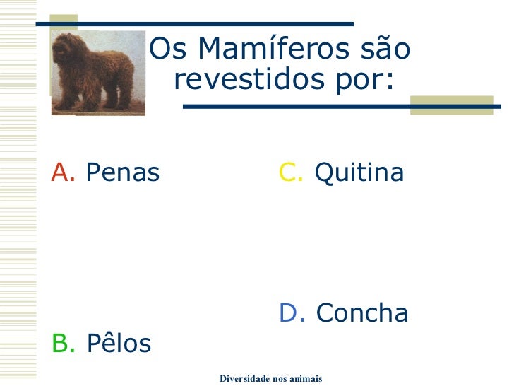 4. 4. Os Mamíferos são revestidos por: <ul><li>A. Penas </li></ul><ul><li>B. Pêlos </li></ul><ul><li>C. Quitina </li></ul><ul><li>D. Concha </li></ul>
