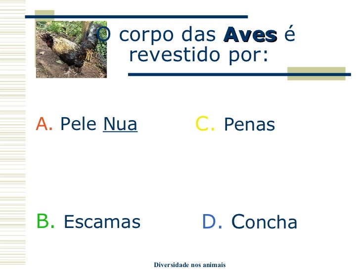 5. 5. O corpo das Aves é revestido por: <ul><li>A. Pele Nua </li></ul><ul><li>B. Escamas </li></ul><ul><li>C. Penas </li></ul><ul><li>D. C oncha </li></ul>