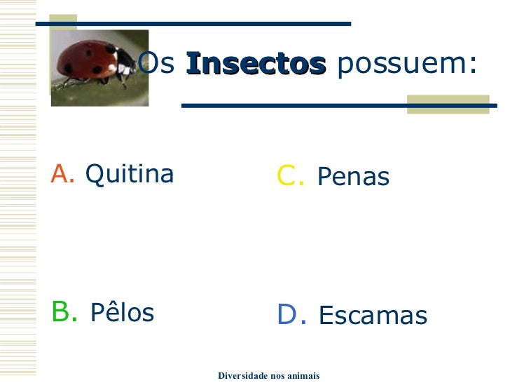 6. 6. Os Insectos possuem: <ul><li>A. Quitina </li></ul><ul><li>B. Pêlos </li></ul><ul><li>C. Penas </li></ul><ul><li>D. Escamas </li></ul>