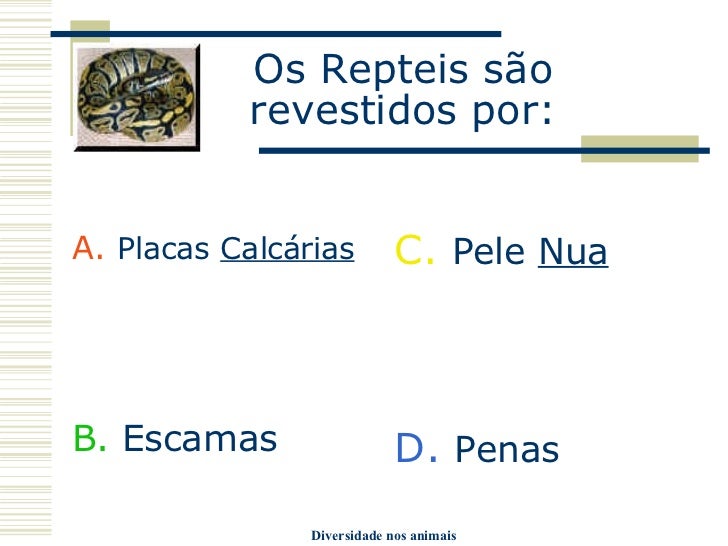 7. 7. Os Repteis são revestidos por: <ul><li>A. Placas Calcárias </li></ul><ul><li>B. Escamas </li></ul><ul><li>C. Pele Nua </li></ul><ul><li>D. Penas </li></ul>