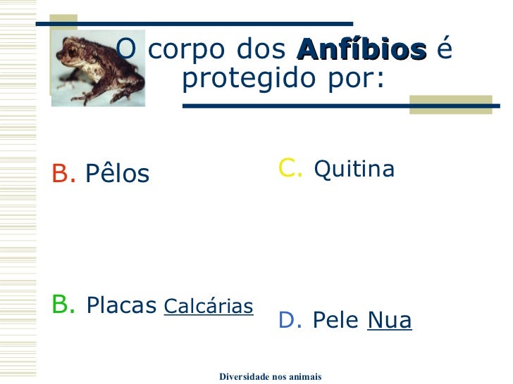 8. 8. O corpo dos Anfíbios é protegido por: <ul><li>Pêlos </li></ul><ul><li>B. Placas Calcárias </li></ul><ul><li>C. Quitina </li></ul><ul><li>D. Pele Nua </li></ul>