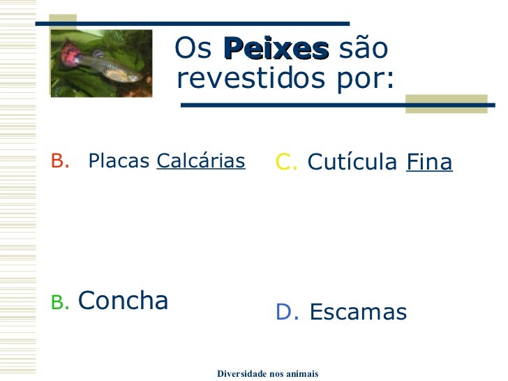 9. 9. Os Peixes são revestidos por: <ul><li>Placas Calcárias </li></ul><ul><li>B. Concha </li></ul><ul><li>C. Cutícula Fina </li></ul><ul><li>D. Escamas </li></ul>