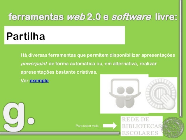 9. 9. Partilha Há diversas ferramentas que permitem disponibilizar apresentações powerpoint de forma automática ou, em alternativa, realizar apresentações bastante criativas. Ver exemplo Para saber mais…
