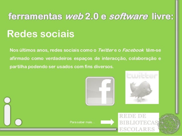 11. 11. Redes sociaisNos últimos anos, redes sociais como o Twitter e o Facebook têm-seafirmado como verdadeiros espaços de interacção, colaboração epartilha podendo ser usados com fins diversos. Para saber mais…