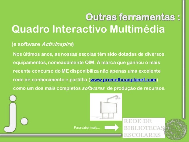 12. 12. Quadro Interactivo Multimédia(e software ActivInspire)Nos últimos anos, as nossas escolas têm sido dotadas de diversosequipamentos, nomeadamente QIM. A marca que ganhou o maisrecente concurso do ME disponibiliza não apenas uma excelenterede de conhecimento e partilha (www.prometheanplanet.com)como um dos mais completos softwares de produção de recursos. Para saber mais…