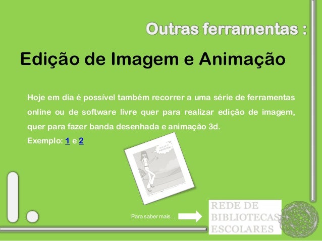 13. 13. Edição de Imagem e AnimaçãoHoje em dia é possível também recorrer a uma série de ferramentasonline ou de software livre quer para realizar edição de imagem,quer para fazer banda desenhada e animação 3d.Exemplo: 1 e 2 Para saber mais…