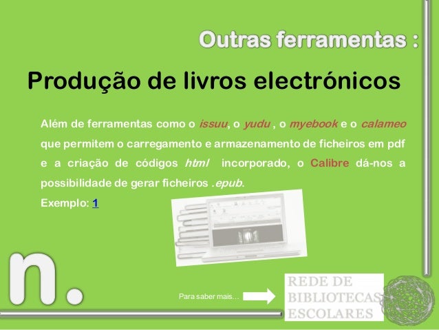 15. 15. Produção de livros electrónicos Além de ferramentas como o issuu, o yudu , o myebook e o calameo que permitem o carregamento e armazenamento de ficheiros em pdf e a criação de códigos html incorporado, o Calibre dá-nos a possibilidade de gerar ficheiros .epub. Exemplo: 1 Para saber mais…
