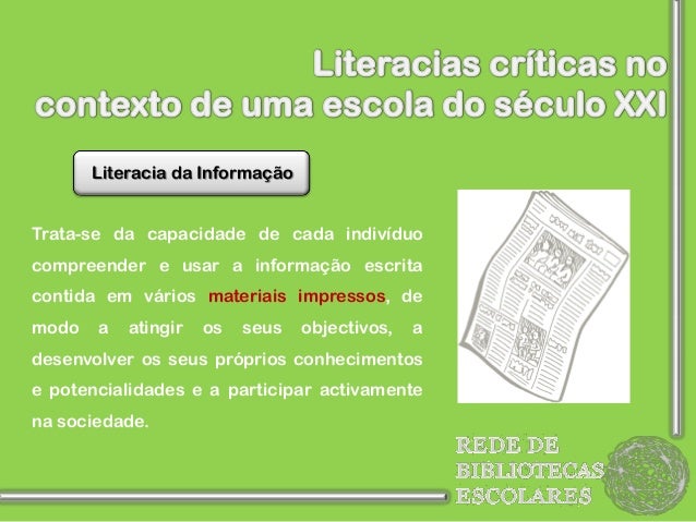 18. 18. Literacia da InformaçãoTrata-se da capacidade de cada indivíduocompreender e usar a informação escritacontida em vários materiais impressos, demodo a atingir os seus objectivos, adesenvolver os seus próprios conhecimentose potencialidades e a participar activamentena sociedade.