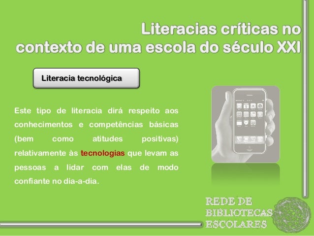 20. 20. Literacia tecnológicaEste tipo de literacia dirá respeito aosconhecimentos e competências básicas(bem como atitudes positivas)relativamente às tecnologias que levam aspessoas a lidar com elas de modoconfiante no dia-a-dia.