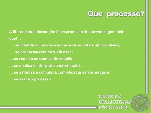 24. 24. A literacia da informação é um processo de aprendizagem peloqual……. se identifica uma necessidade ou se define um problema;…. se procuram recursos eficazes;… se reúne e consome informação;… se analisa e interpreta a informação;… se sintetiza e comunica com eficácia a informação e… se avalia o processo.