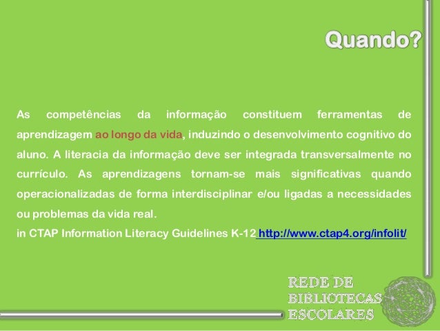 25. 25. As competências da informação constituem ferramentas deaprendizagem ao longo da vida, induzindo o desenvolvimento cognitivo doaluno. A literacia da informação deve ser integrada transversalmente nocurrículo. As aprendizagens tornam-se mais significativas quandooperacionalizadas de forma interdisciplinar e/ou ligadas a necessidadesou problemas da vida real.in CTAP Information Literacy Guidelines K-12 http://www.ctap4.org/infolit/