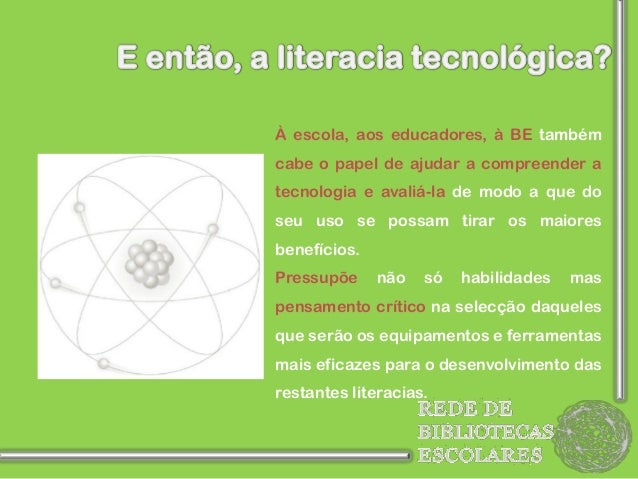 27. 27. À escola, aos educadores, à BE tambémcabe o papel de ajudar a compreender atecnologia e avaliá-la de modo a que doseu uso se possam tirar os maioresbenefícios.Pressupõe não só habilidades maspensamento crítico na selecção daquelesque serão os equipamentos e ferramentasmais eficazes para o desenvolvimento dasrestantes literacias.