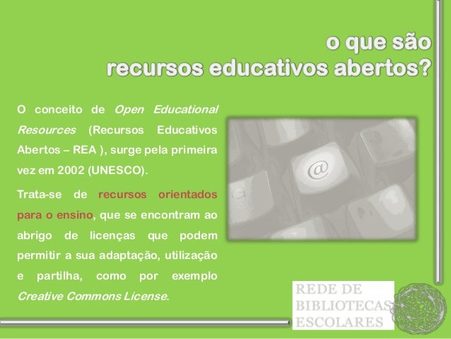 28. 28. O conceito de Open EducationalResources (Recursos EducativosAbertos – REA ), surge pela primeiravez em 2002 (UNESCO).Trata-se de recursos orientadospara o ensino, que se encontram aoabrigo de licenças que podempermitir a sua adaptação, utilizaçãoe partilha, como por exemploCreative Commons License.