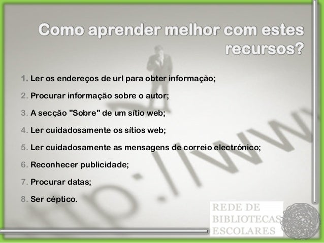 2. 2. 1. Ler os endereços de url para obter informação;2. Procurar informação sobre o autor;3. A secção "Sobre" de um sítio web;4. Ler cuidadosamente os sítios web;5. Ler cuidadosamente as mensagens de correio electrónico;6. Reconhecer publicidade;7. Procurar datas;8. Ser céptico.