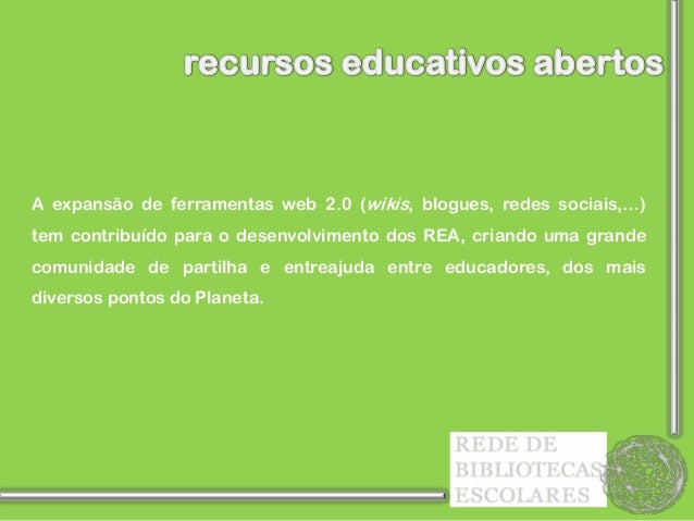 29. 29. A expansão de ferramentas web 2.0 (wikis, blogues, redes sociais,…)tem contribuído para o desenvolvimento dos REA, criando uma grandecomunidade de partilha e entreajuda entre educadores, dos maisdiversos pontos do Planeta.