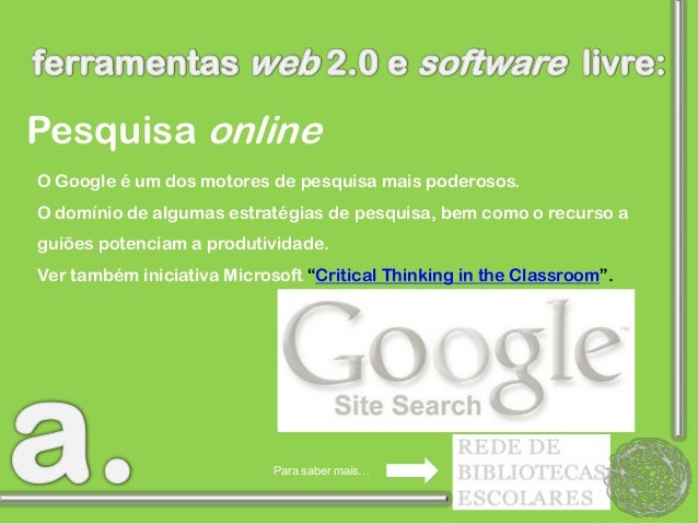 3. 3. Pesquisa onlineO Google é um dos motores de pesquisa mais poderosos.O domínio de algumas estratégias de pesquisa, bem como o recurso aguiões potenciam a produtividade.Ver também iniciativa Microsoft “Critical Thinking in the Classroom”. Para saber mais…