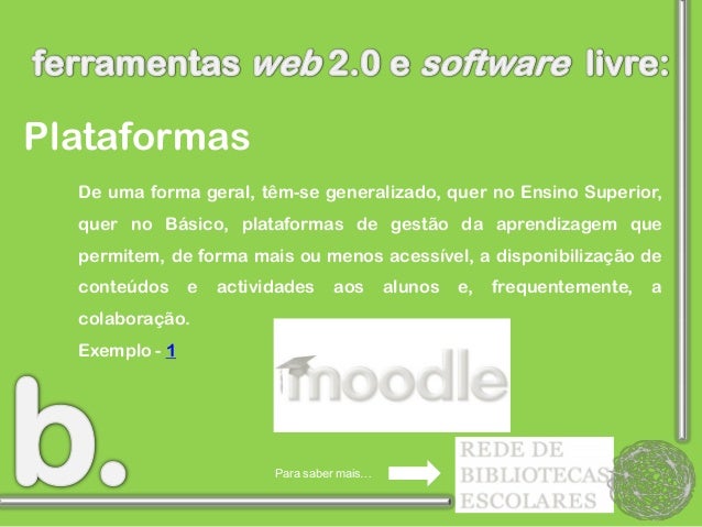 4. 4. Plataformas De uma forma geral, têm-se generalizado, quer no Ensino Superior, quer no Básico, plataformas de gestão da aprendizagem que permitem, de forma mais ou menos acessível, a disponibilização de conteúdos e actividades aos alunos e, frequentemente, a colaboração. Exemplo - 1 Para saber mais…