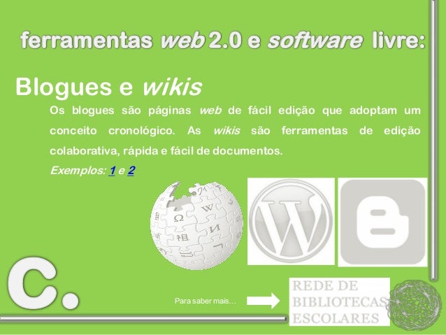 5. 5. Blogues e wikis Os blogues são páginas web de fácil edição que adoptam um conceito cronológico. As wikis são ferramentas de edição colaborativa, rápida e fácil de documentos. Exemplos: 1 e 2 Para saber mais…