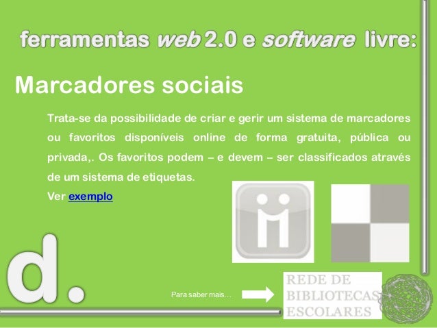 6. 6. Marcadores sociais Trata-se da possibilidade de criar e gerir um sistema de marcadores ou favoritos disponíveis online de forma gratuita, pública ou privada,. Os favoritos podem – e devem – ser classificados através de um sistema de etiquetas. Ver exemplo Para saber mais…