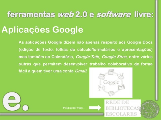 7. 7. Aplicações Google As aplicações Google dizem não apenas respeito aos Google Docs (edição de texto, folhas de cálculo/formulários e apresentações) mas também ao Calendário, Google Talk, Google Sites, entre várias outras que permitem desenvolver trabalho colaborativo de forma fácil a quem tiver uma conta Gmail. Para saber mais…