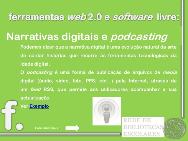 8. 8. Narrativas digitais e podcasting Podemos dizer que a narrativa digital é uma evolução natural da arte de contar histórias que recorre às ferramentas tecnológicas da idade digital. O podcasting é uma forma de publicação de arquivos de media digital (áudio, vídeo, foto, PPS, etc…) pela Internet, através de um feed RSS, que permite aos utilizadores acompanhar a sua actualização. Ver Exemplo Para saber mais…