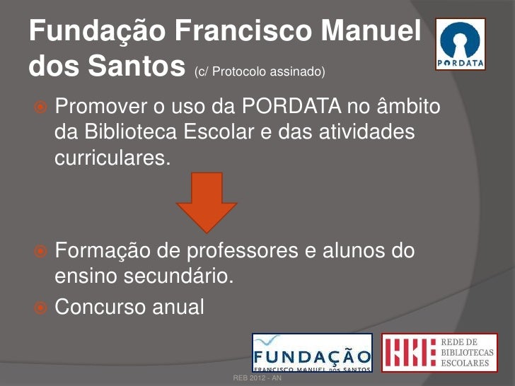 10. 10. Fundação Francisco Manueldos Santos (c/ Protocolo assinado) Promover o uso da PORDATA no âmbito da Biblioteca Escolar e das atividades curriculares. Formação de professores e alunos do ensino secundário. Concurso anual REB 2012 - AN