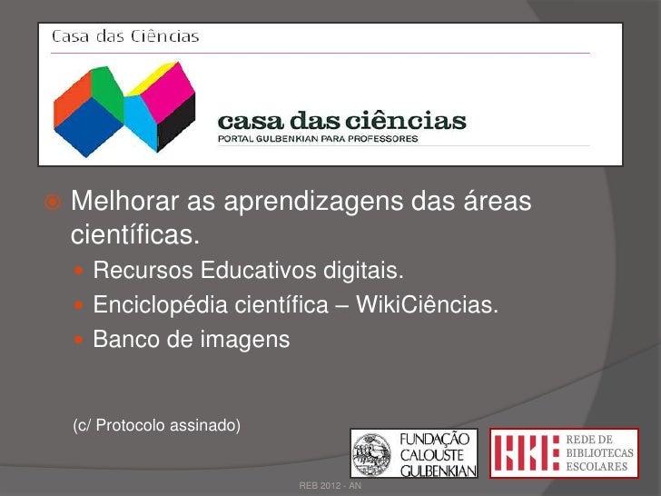 11. 11.  Melhorar as aprendizagens das áreas científicas.  Recursos Educativos digitais.  Enciclopédia científica – WikiCiências.  Banco de imagens (c/ Protocolo assinado) REB 2012 - AN