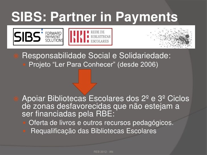 12. 12. SIBS: Partner in Payments Responsabilidade Social e Solidariedade:  Projeto “Ler Para Conhecer” (desde 2006) Apoiar Bibliotecas Escolares dos 2º e 3º Ciclos de zonas desfavorecidas que não estejam a ser financiadas pela RBE:  Oferta de livros e outros recursos pedagógicos.  Requalificação das Bibliotecas Escolares REB 2012 - AN