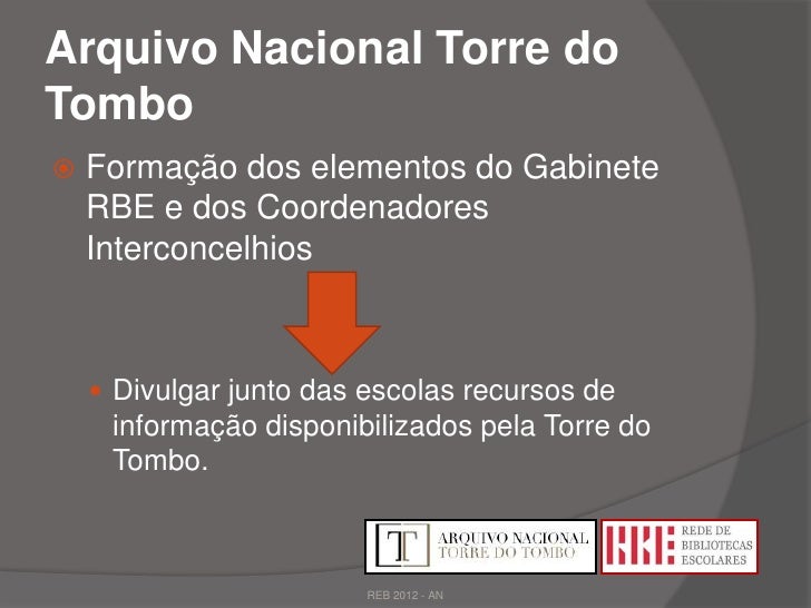 13. 13. Arquivo Nacional Torre doTombo Formação dos elementos do Gabinete RBE e dos Coordenadores Interconcelhios  Divulgar junto das escolas recursos de informação disponibilizados pela Torre do Tombo. REB 2012 - AN