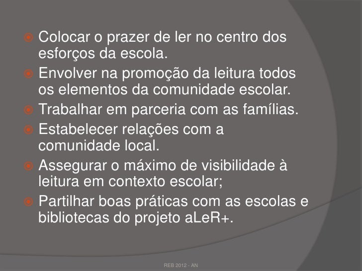 15. 15.  Colocar o prazer de ler no centro dos esforços da escola. Envolver na promoção da leitura todos os elementos da comunidade escolar. Trabalhar em parceria com as famílias. Estabelecer relações com a comunidade local. Assegurar o máximo de visibilidade à leitura em contexto escolar; Partilhar boas práticas com as escolas e bibliotecas do projeto aLeR+. REB 2012 - AN