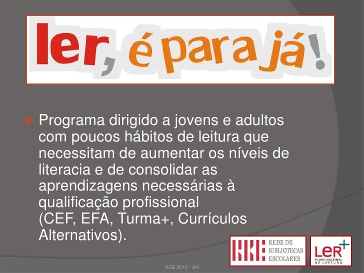16. 16.  Programa dirigido a jovens e adultos com poucos hábitos de leitura que necessitam de aumentar os níveis de literacia e de consolidar as aprendizagens necessárias à qualificação profissional (CEF, EFA, Turma+, Currículos Alternativos). REB 2012 - AN