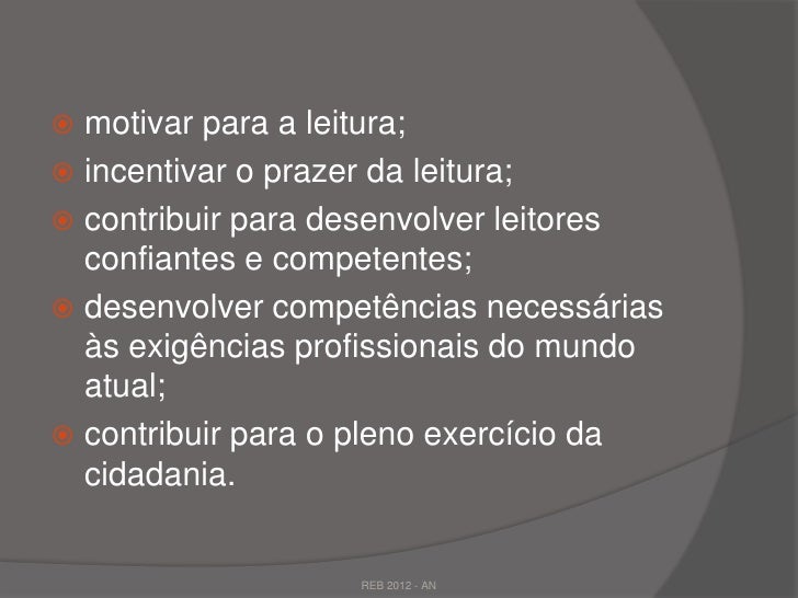 17. 17.  motivar para a leitura; incentivar o prazer da leitura; contribuir para desenvolver leitores confiantes e competentes; desenvolver competências necessárias às exigências profissionais do mundo atual; contribuir para o pleno exercício da cidadania. REB 2012 - AN